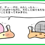 殻をぬぎたいかたつむりと、殻をぬいだかたつむりが自己紹介をしているよ。でも、殻をぬいだかたつむりの様子が少しおかしいみたい?