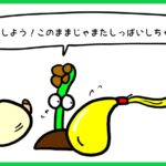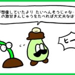 もるもるくんが一気に青唐辛子を食べてしまったことに気付いたわらびくん。もるもるくんのことが心配だけど、うかつに近づけないみたいだよっ!