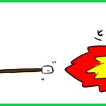 思いつくまでの間、マシュマロを焼いて待つことにしたわらびくん。どうやって焼くのかな?もしかして・・・。